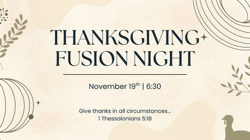 The best night of the month is fusion night! You don't want to miss this night of friends, games, food, prizes, and good news, and this month it's a special Thanskgiving addition! 6:30-8 pm See you there!
